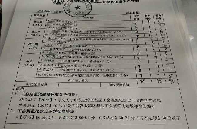 檢查組對照檢查標準對公司工會建設情況進行了現(xiàn)場打分,給予了96分(示范)的高分評價。邱影監(jiān)事長代表公司工會對區(qū)總工會的關心和支持表示感謝,強調公司下一步將繼續(xù)在區(qū)總工會領導下,持續(xù)加強職工之家建設,營造更加溫馨的工作環(huán)境,讓員工真正愛企業(yè)、維護企業(yè),以企業(yè)為家。